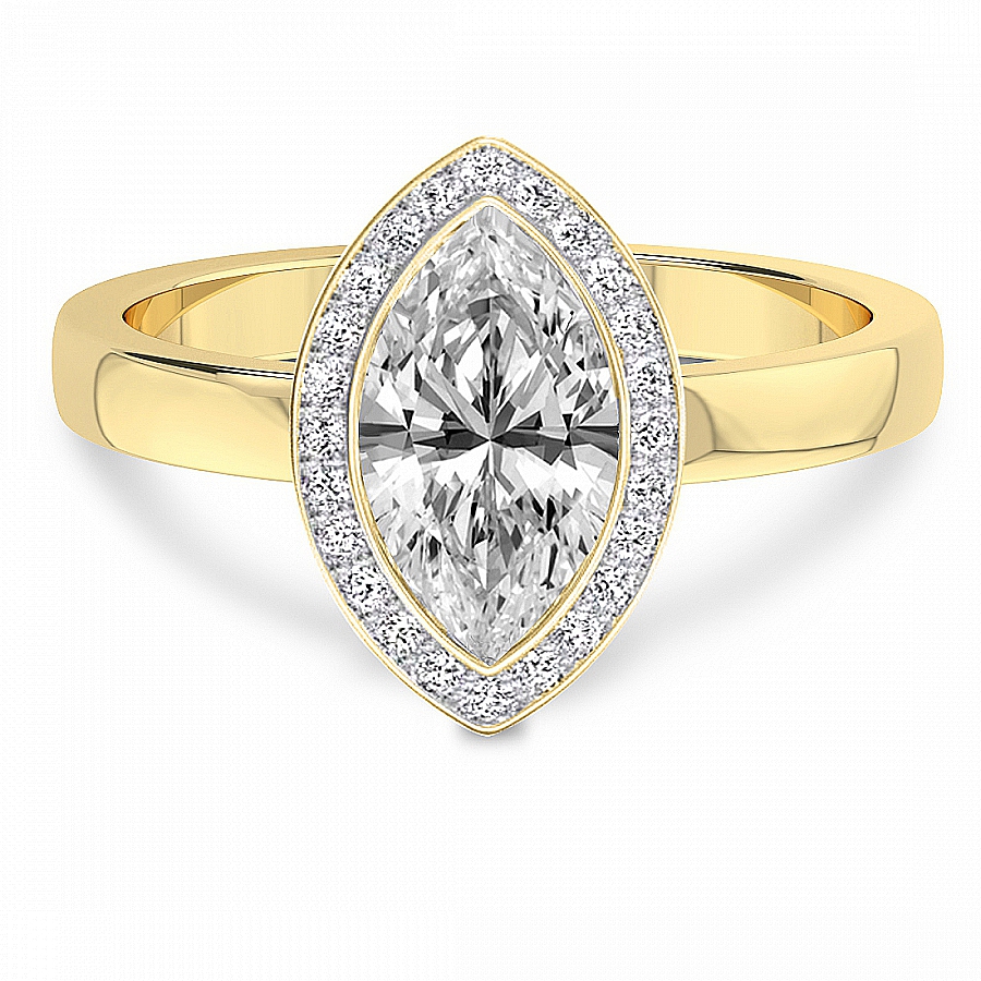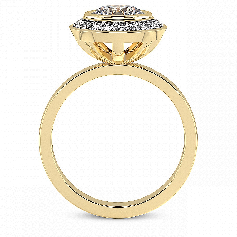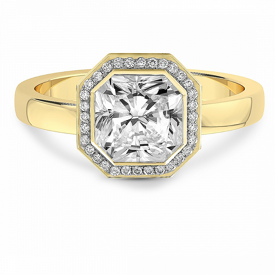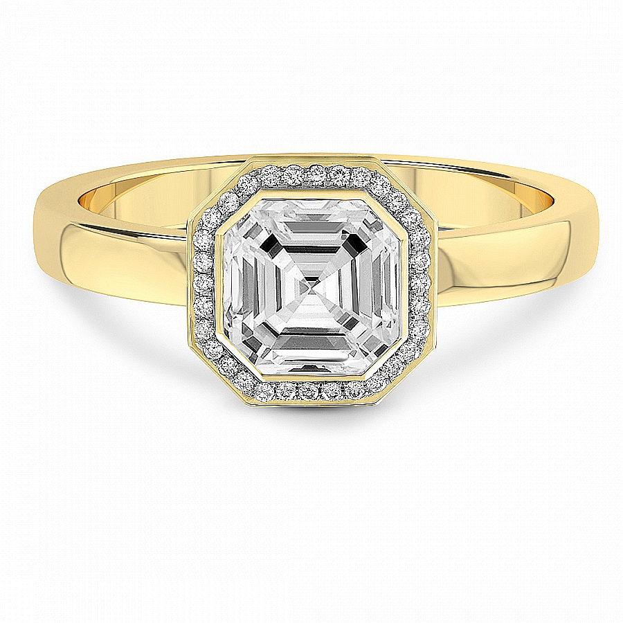 This Alina Dome Bezel Halo Ring is a Emerald shape ring Engagement type 18k Yellow Gold
