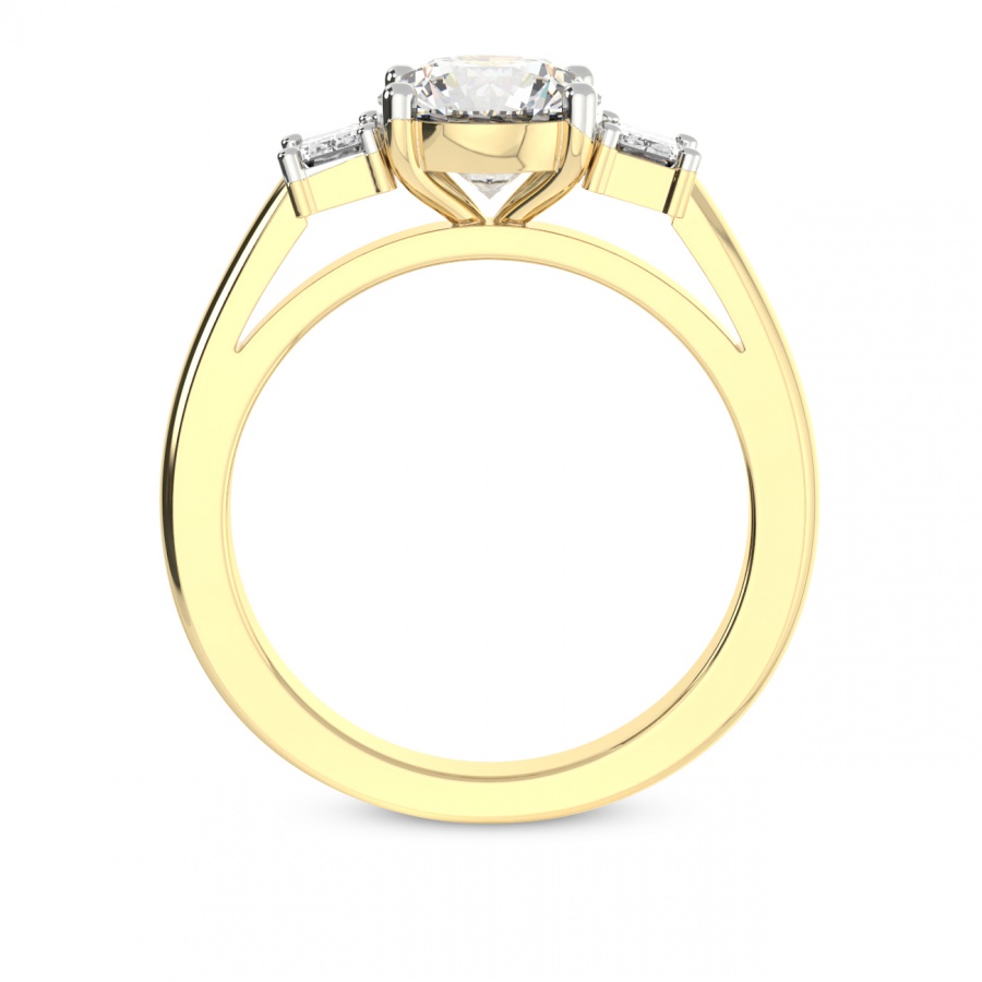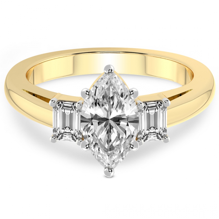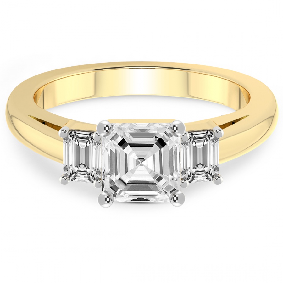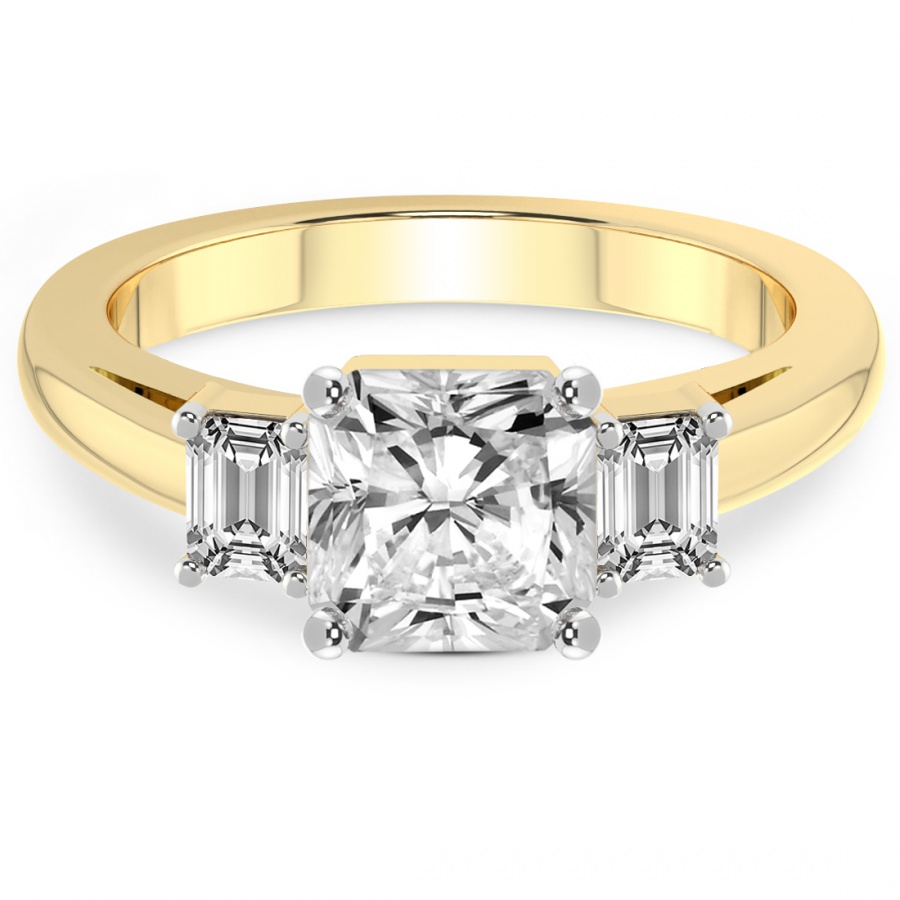 This Genevieve Three Stone Side Emerald Diamond Ring is a Emerald shape ring Engagement type 18k Yellow Gold