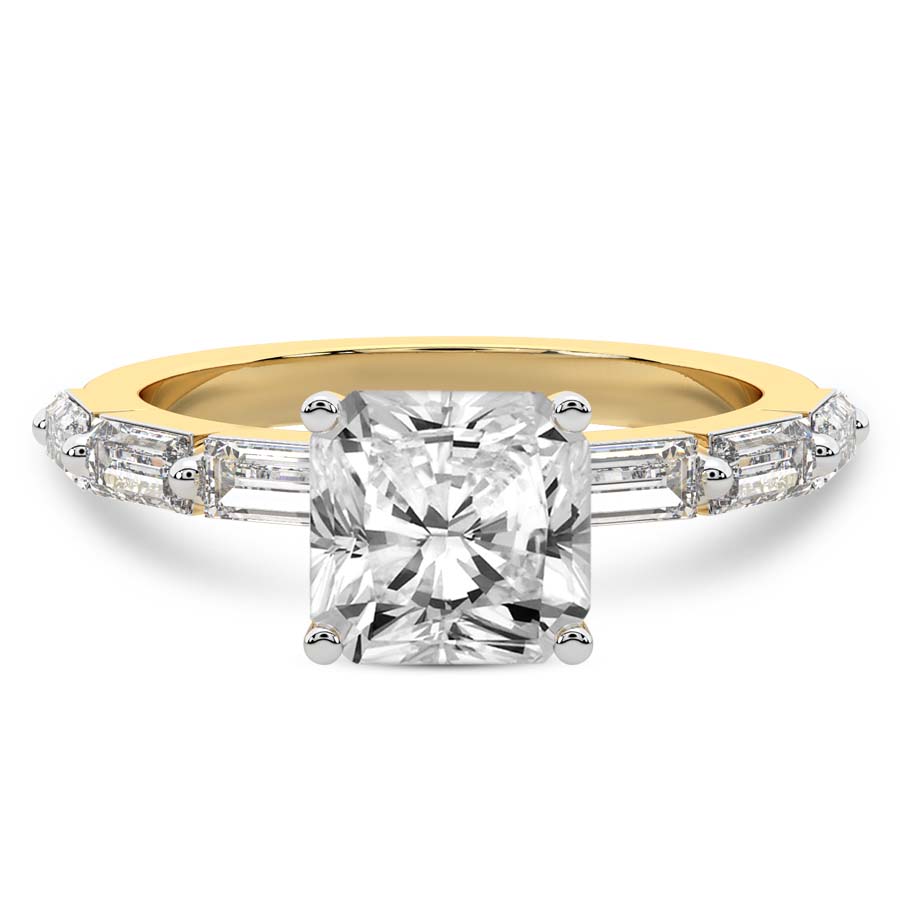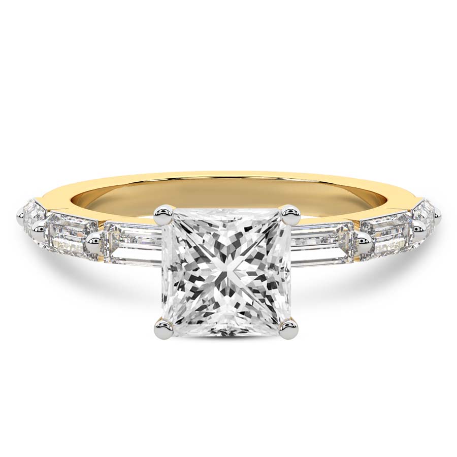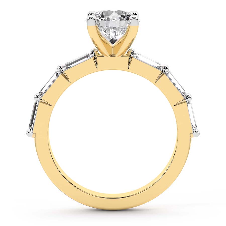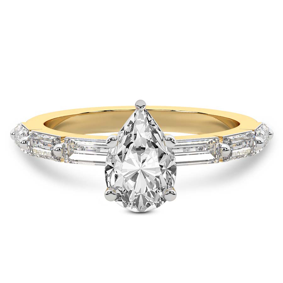 This Bella Baguette Side Stone Ring is a Heart shape ring Engagement type 18k Yellow Gold