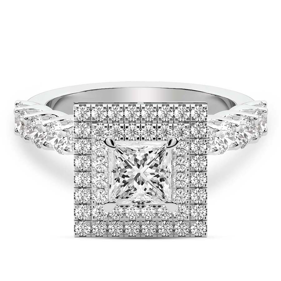 This Zinnia Side Stones Halo Diamond Ring is a Princess shape ring Engagement type pt Platinum