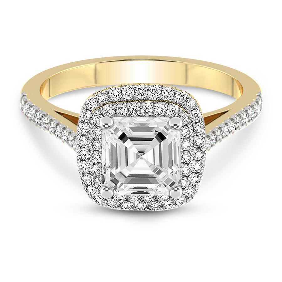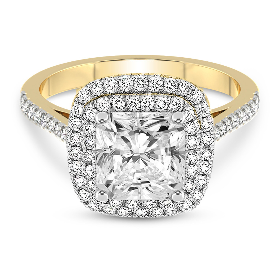 This Brianna Double Halo Diamond Ring is a Princess shape ring Engagement type 18k Yellow Gold