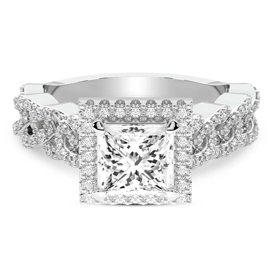 This Serenity Halo Celtic Knot Diamond Ring is a Princess shape ring Engagement type pt Platinum
