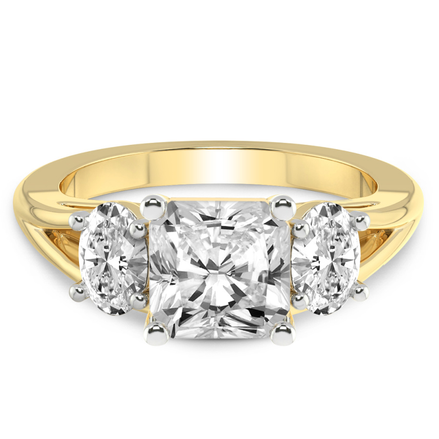 This Noorie Three Stone Side Oval Diamond Ring is a Radiant shape ring Engagement type 18k Yellow Gold