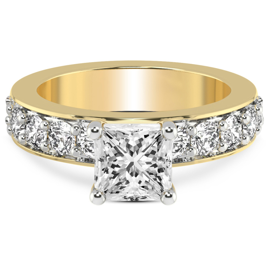 This Margaret Side Stone Knife Edge Diamond Ring is a Princess shape ring Engagement type 18k Yellow Gold