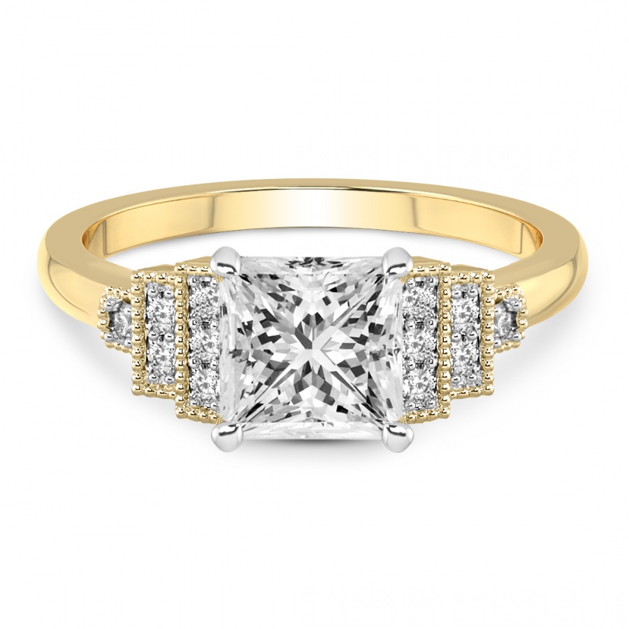 This Delphine Side Stone Diamond Ring is a Princess shape ring Engagement type 18k Yellow Gold
