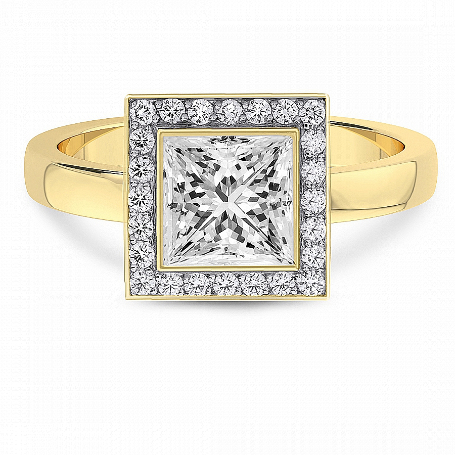 This Alina Dome Bezel Halo Ring is a Princess shape ring Engagement type 18k Yellow Gold