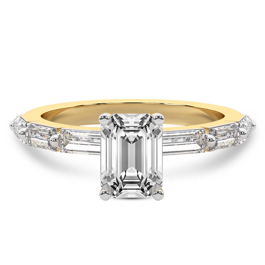 This Bella Baguette Side Stone Ring is a Emerald shape ring Engagement type 18k Yellow Gold