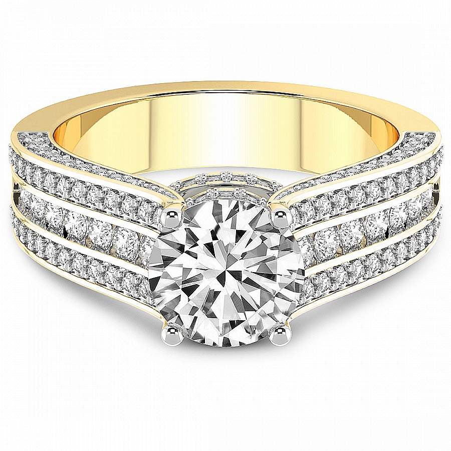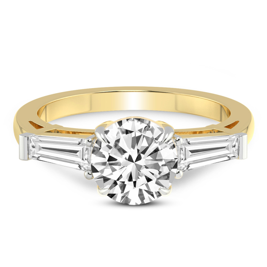 This Fiona Three Stone Side Trapezium Diamond Ring is a Round shape ring Engagement type 18k Yellow Gold